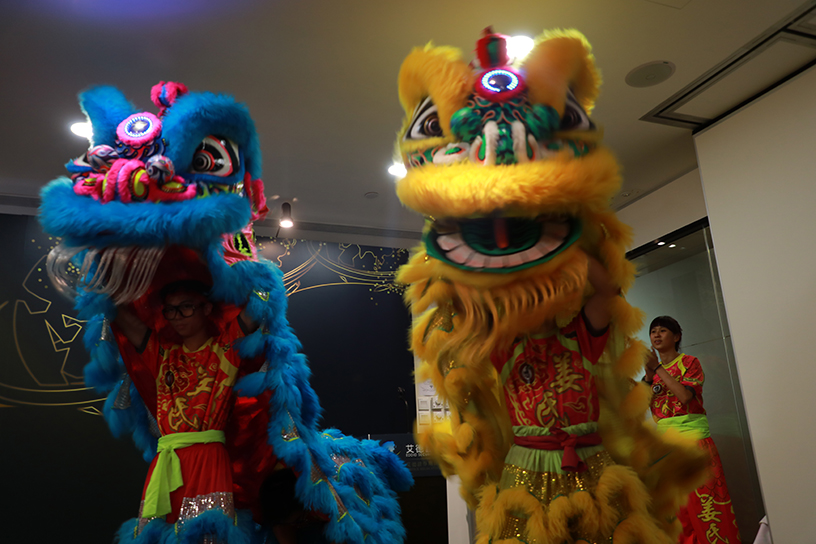 臨近下午6點,喬遷典禮已進行到高潮,場內迎來了兩對神采奕奕身姿矯健的舞獅用以助興。伴隨著鑼鼓聲,兩只舞獅跟隨著音樂進行各種形態變化,舞獅助興意味著生活吉祥如意,生意財源廣進。舞獅也和龍一樣需要點睛,艾德證券期貨首席執行官張國榮先生接過禮儀小姐手中的金毛筆,進行醒獅點睛。