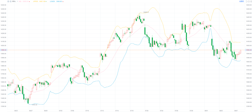 8月7日,納斯達克綜合指數1小時K線圖顯示,指數跳空落至EMA60均線下方後步入寬幅震盪區間,區間上沿回溯觸及EMA60均線後迅速回落,後小幅反彈,突破EMA20均線。從技術指標來看,BOLL布林線軌道走平;買入成交量放大;MACD金叉,但紅柱無量;KDJ金叉,三線走擴。料想,短期來看指數向上站穩BOLL布林線中軌的可能性較低,關注當前重要阻力位,即BOLL布林線中軌的13978.52點位,及下方重要支撐位,即BOLL布林線下軌的13869.86點位。