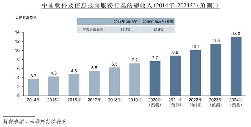 近年来,中国软件及信息技术服务行业市场规模(以收入计)增长强劲,从2014年的3.7万亿元人民币增至2019年的7.2万亿元人民币,年复合增长率为14.2%,并预计在2024年达到13.0万亿元人民币,自2019年起的年复合增长率为12.5%。